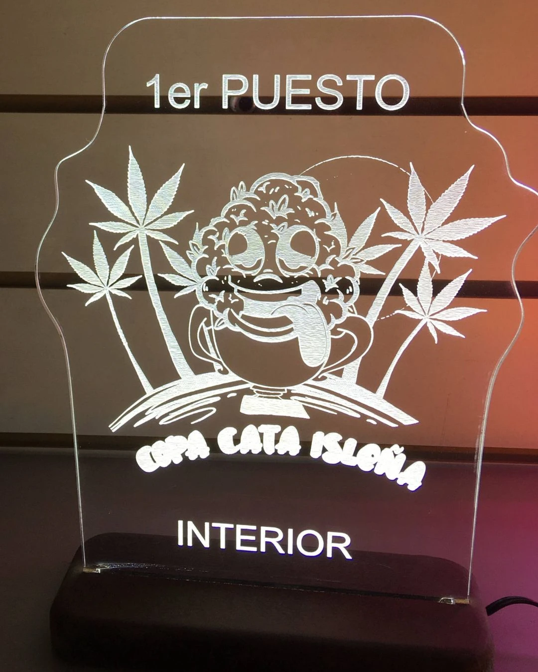 Acrilico con corte láser y grabado personalizado en base de madera con luz led interior que ilumina el premio desde abajo resaltando el diseño del mismo