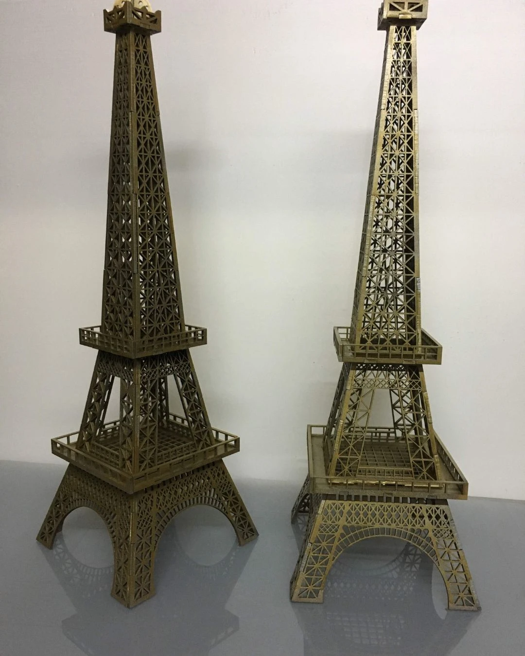 Estatua de la torre Eiffel en MDF a corte láser por piezas ensambladas con un acabado metalizado logrado en pintura